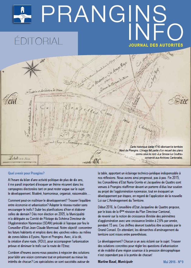 Editorial : Quel avenir pour Prangins ? A l'heure du bilan d'une activité politique de plus de dix ans, il me paraît important d'évoquer un thème récurent dans les campagnes électorales tant on peut rester vague sur le sujet : le développement. Modéré, harmonieux, organisé, raisonnable...