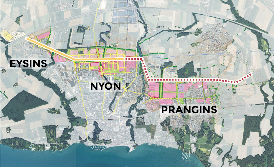 En rose, les projets de quartiers à développer; en jaune, la RDU existante; en pointillé rouge la RDU à créer entre Nyon (St-Cergue) et Prangins (carrefour des Murettes) Source: Etude Feddersen